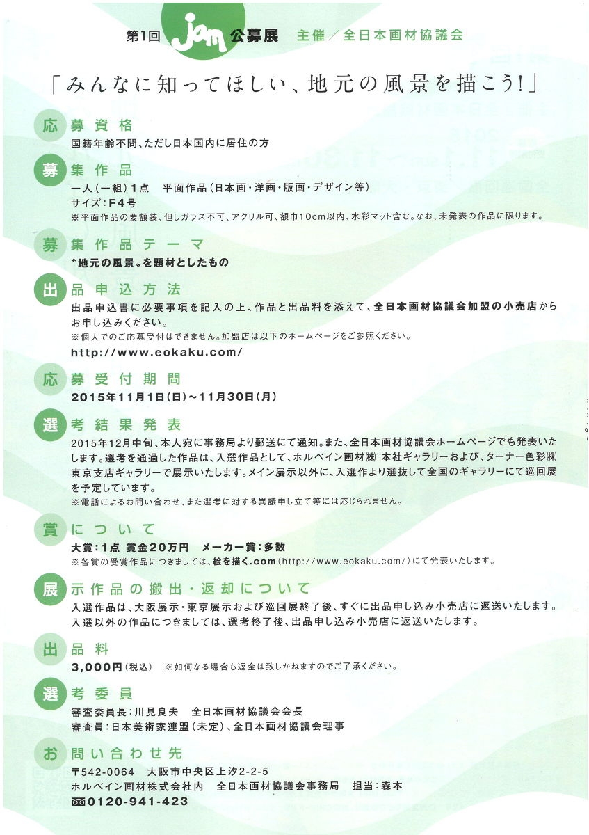 全日本画材協議会様より、第1回 jam 公募展 のご案内を頂きました。