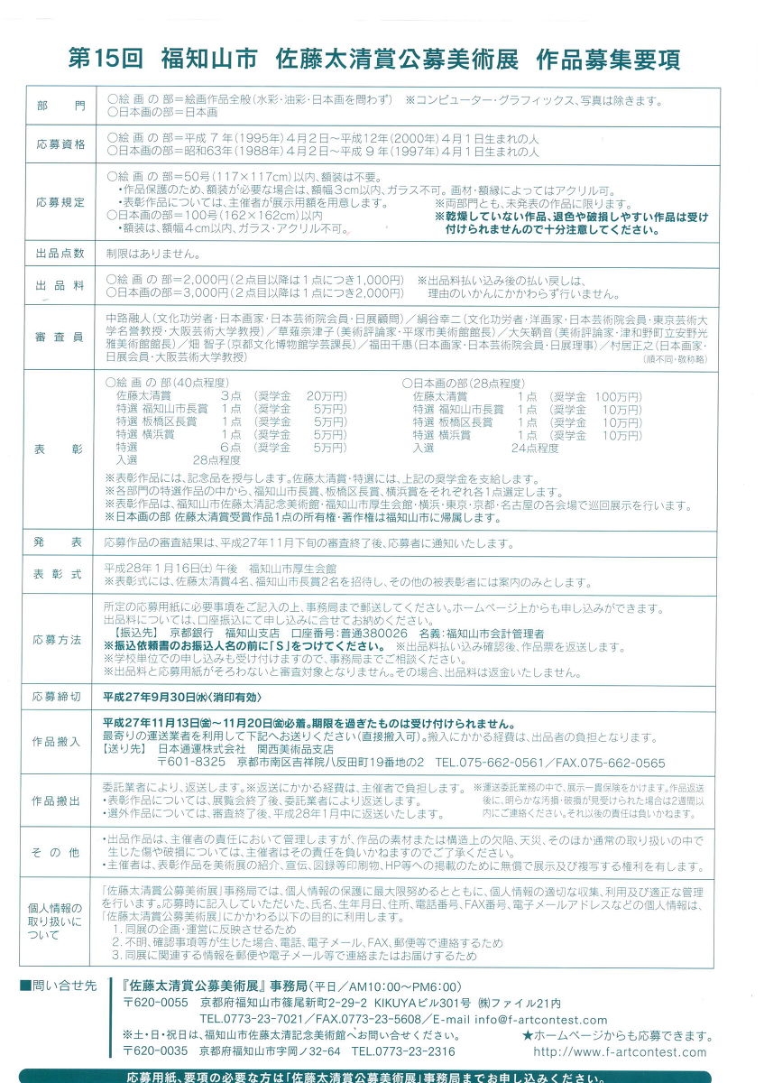 第15回 福知山市 佐藤 太清 賞 公募美術展 作品募集のご案内をいただきました。